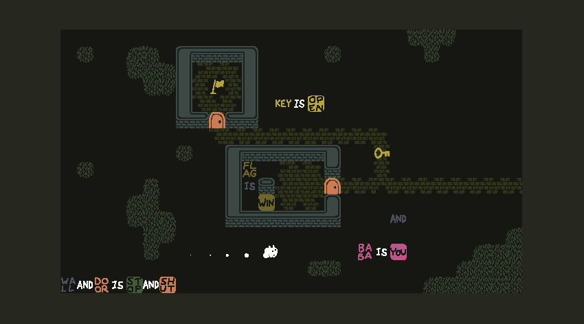 Sin embargo, ¿qué pasaría si la bandera estuviera rodeada por muros que impiden el acceso? En otro juego de acertijos, tal vez se buscaría una forma de trepar el muro para alcanzarla. Sin embargo, en Baba is you, se puede buscar la forma de cambiar la proposición “BABA – IS – YOU” a “WALL – IS – YOU” y, con esto, controlar los muros que con anterioridad bloqueaban el camino, e inclusive usarlos para tocar la bandera y superar el nivel.